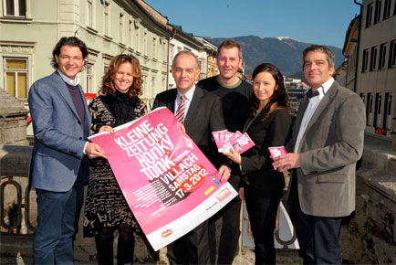 Das Foto wurde anlässlich der Programmpräsentation mit Blick über den Hauptplatz gemacht. Im Bild v.l.n.r. Stadtrat Peter Weidinger, Marketingleiterin der Kleinen Zeitung Susanne Kuttnig, Vizebürgermeister Richard Pfeiler, Honky Tonk Veranstalter Reinhold Bauer, Marketingleiterin der Villacher Brauerei Bettina Rabitsch und der Chef des Villacher Stadtmarketings Gerhard Angerer.